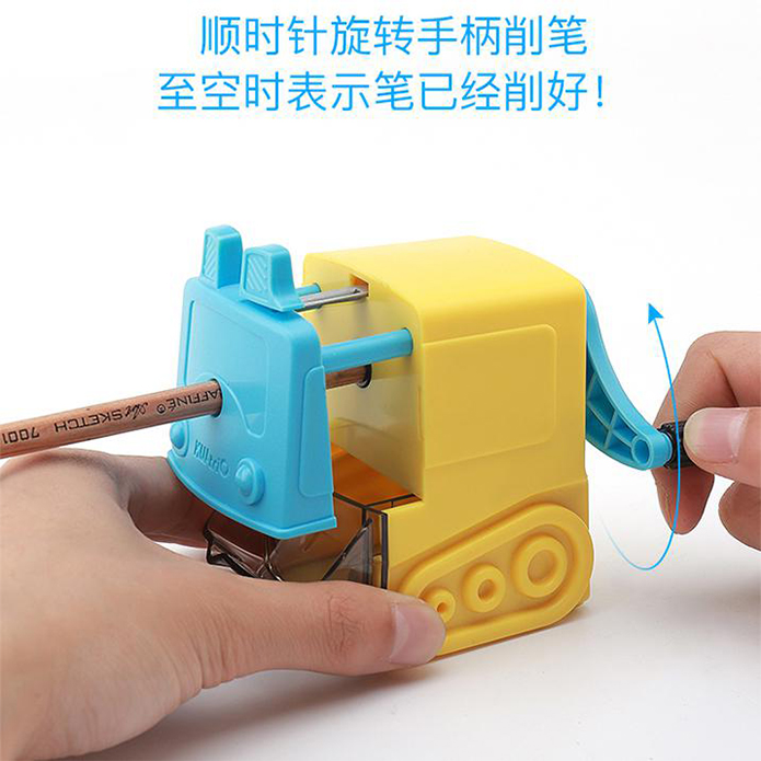 這款堆土機(jī)削筆機(jī)不僅可以玩耍,在使用起來也是很方便。首先將前蓋拉出一段距離,按住前置按鈕,插入鉛筆固定,然后順時(shí)針旋轉(zhuǎn)手柄削筆,至空轉(zhuǎn)時(shí)表示筆已經(jīng)削好;最后按下按鈕,取出已削好的鉛筆。還有不要忘記轉(zhuǎn)削完成后要及時(shí)抽出筆屑盒清理鉛筆屑,以保持干凈利落。