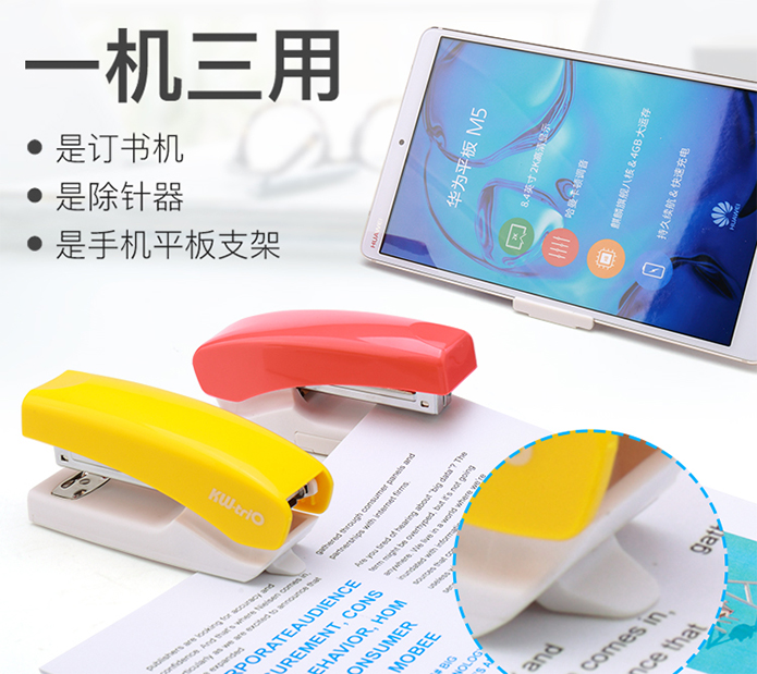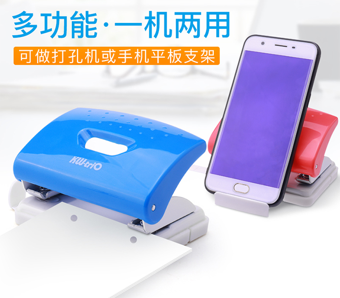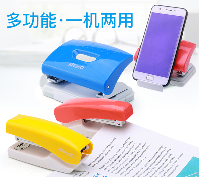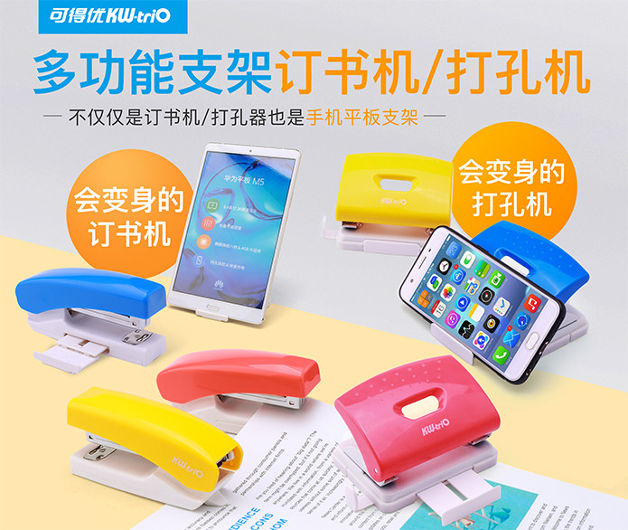 可得優(yōu)多功能支架訂書機和多功能支架打孔機,它們不只是訂書機和打孔機,也是手機平板支架。訂書機和打孔機底座部分拉出支架,搖身一變手機平板支架。可放置手機、平板,橫屏豎屏均可,方便看視頻,開遠程視頻會議等。不占用桌面多余空間,就可解決手機支架問題,同時給普通的辦公文具增添了萌萌的一面,工作也變得很輕松愉悅。