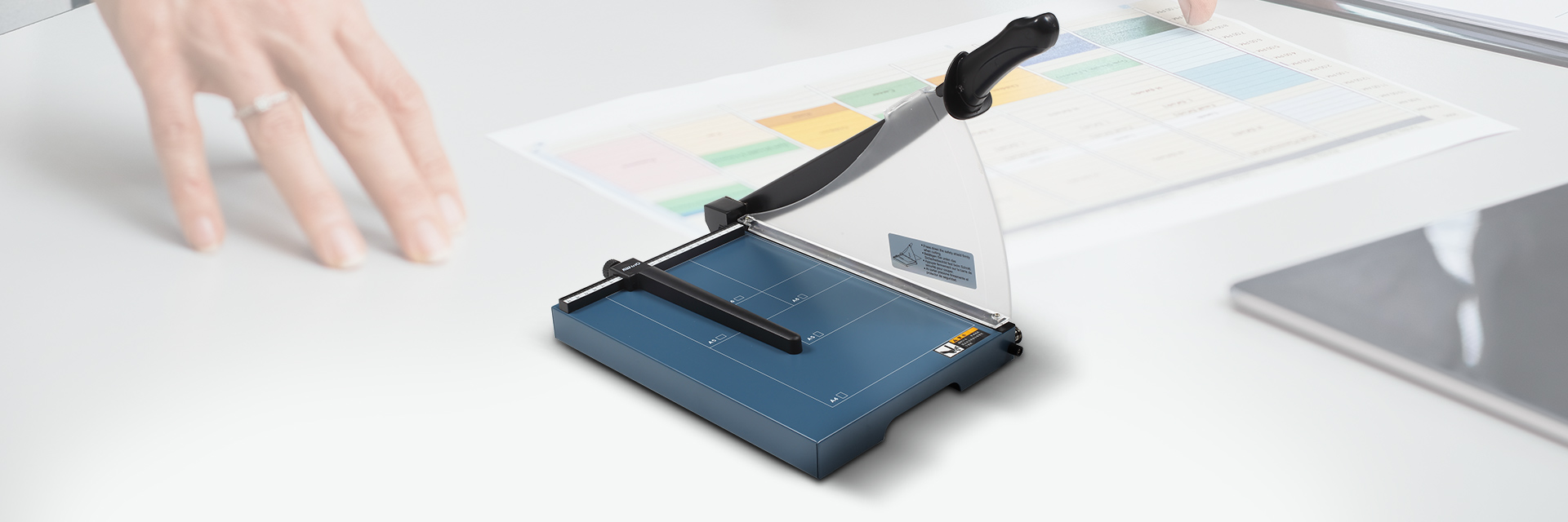 適用于裁切相片/卡片/藝術紙張等 側(cè)邊帶有安全防護板 保護操作安全 鎖刀開關 結束操作可鎖定刀刃保障安全