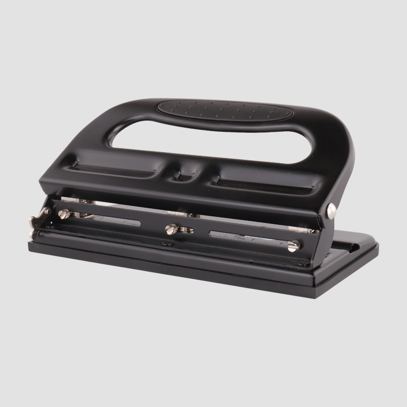 強力金屬結(jié)構(gòu),堅固耐用,可更換刀頭,三孔間距可根據(jù)需要調(diào)整,附有導(dǎo)尺打孔定位。